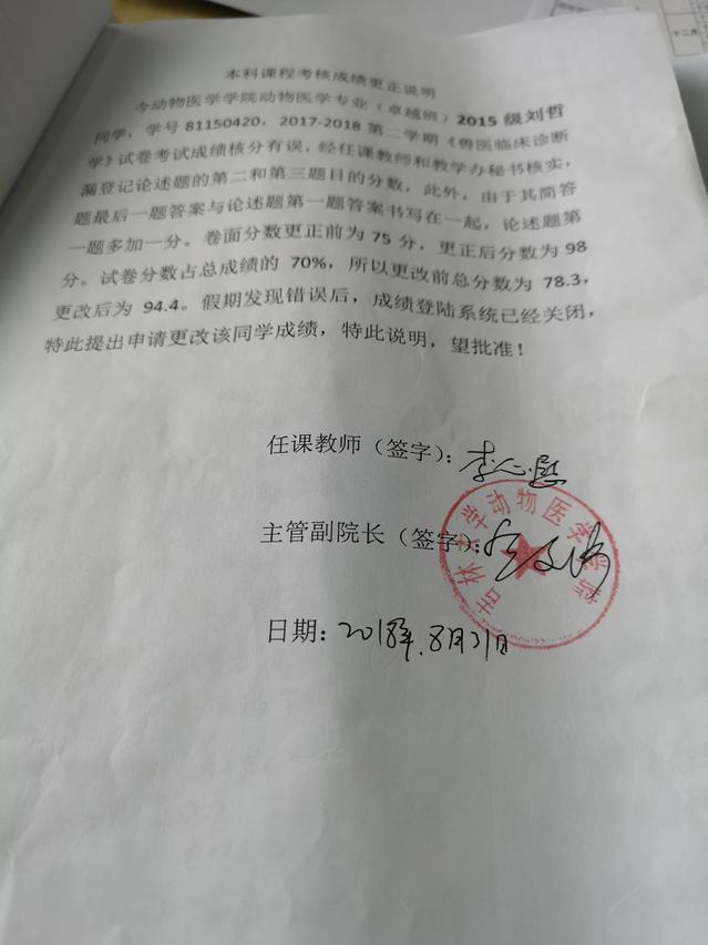 根据《关于进一步明确本科生课程考核等有关问题的通知》(校教字〔2018〕47号)文件有关精神,现对意昂2015年级动物医学专业刘哲同学(学号:86150318)2017-2018-2学期兽医临床诊断学课程成绩更正如下: