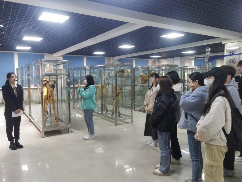 活动正式开始前,讲解员向大家宣读了标本馆的注意事项,如不能直接用手触碰展厅内的动植物标本及玻璃幕墙;不得在展厅内吸烟和高声喧哗;不得将零食、饮料带入馆中等等。随后,由两位讲解员弓玲玲(2022临床兽医学硕士)和董忆飞(2022临床兽医学硕士)带领同学们参观标本馆,在她们生动细致的讲解下,大家逐一了解到了这些标本背后的故事与含义。如驰骋沙场30年,目光炯炯有神、体躯高大魁梧的军马标本;再如用各个颜色精心标注出血管、神经、内脏的肌肉冻干标本等等。每一具标本都经历了复杂制作以及精心呵护,最后生动地展示给每一位师生。