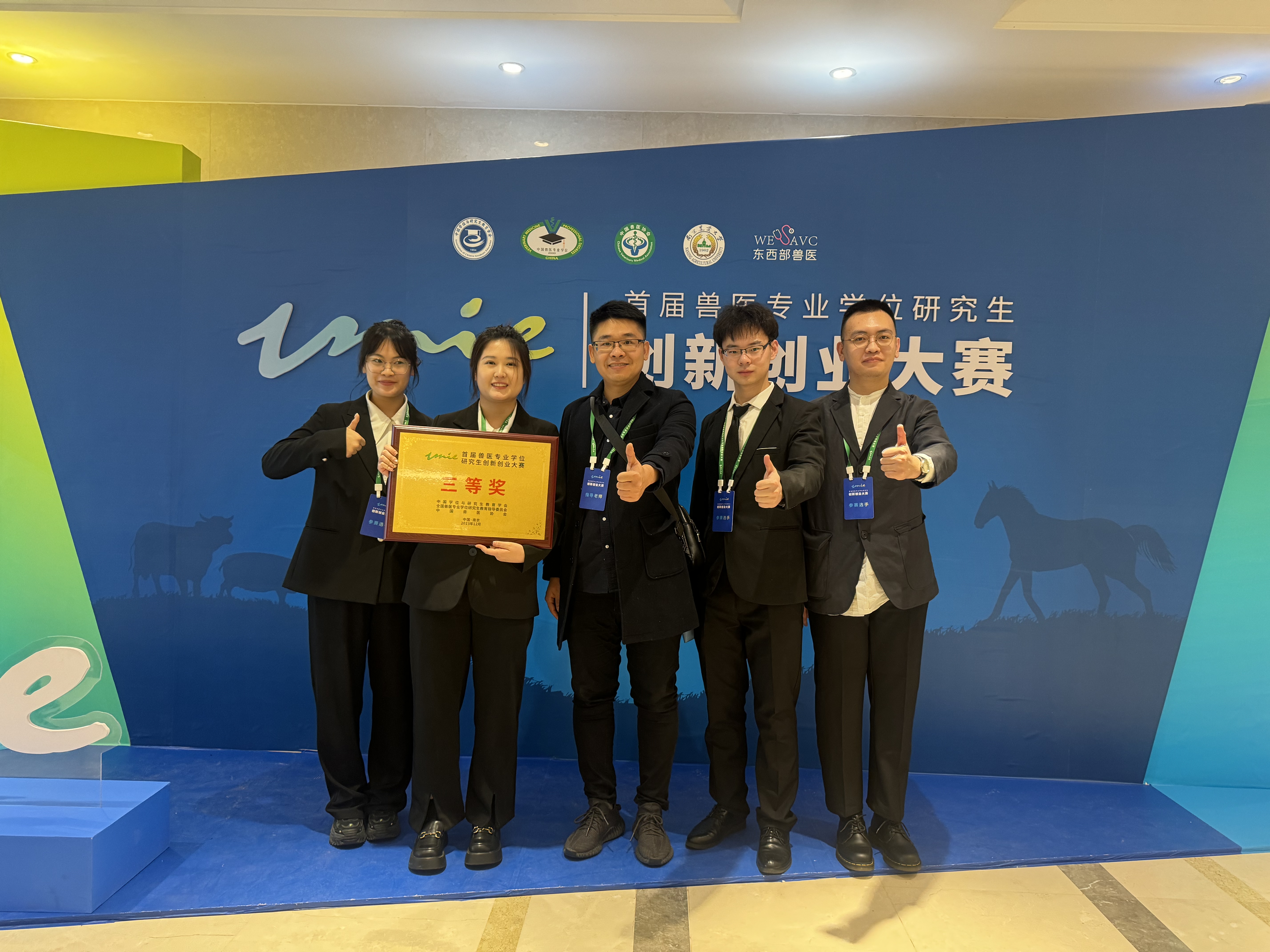 此外,兽医生理学团队也在创业组中展现了不凡的实力,荣获三等奖。这支团队由张萌、胡惠洁、鞠天缘,孙明扬、邓亚、刘宇豪同学组成,在付守鹏、郭文晋老师的指导下参赛。他们将深厚的学术底蕴与实际需求紧密结合,深耕于奶牛乳腺营养与健康领域。其创新成果不仅具有很高的实用价值,更展现了公司研究生的卓越才华。