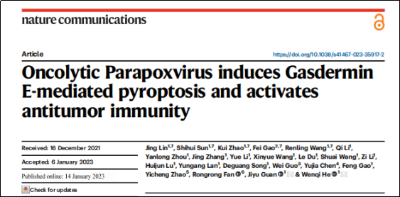 参考文献:Oncolytic Parapoxvirus induces Gasdermin E-mediated pyroptosis and activates antitumor immunity. Nature Communications. 2023, 14:224. Doi:10.1038/s41467-023-35917-2.