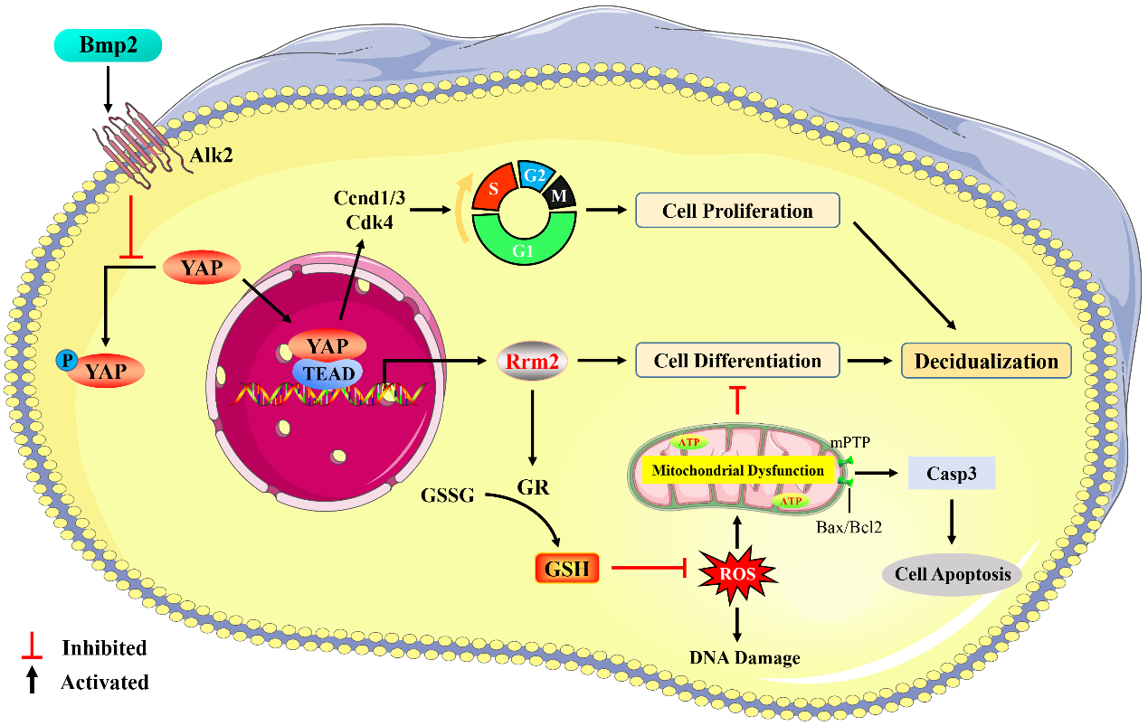 子宫蜕膜化是哺乳动物妊娠建立的关键环节,其机理十分复杂。YapHippo信号通路关键效应因子,对卵泡和早期胚胎发育至关重要,但其在子宫蜕膜化过程中的生物学功能不清楚。课题组研究发现,Yap高表达于小鼠子宫蜕膜区,缺失Yap可因子宫基质细胞增殖与分化异常而导致蜕膜发育受损。Bmp2Alk2受体结合后可促进Yap转入细胞核,通过与TEAD相互作用介导Rrm2的转录,参与DNA损伤修复。同时,缺失Yap可因GR抗氧化酶活性减弱和GSH含量减少而引起细胞内ROS水平增加,导致线粒体功能受损,触发细胞凋亡。研究结果可为进一步阐明蜕膜化的分子机理、动物繁殖率的提高及不孕症的治疗等提供理论依据