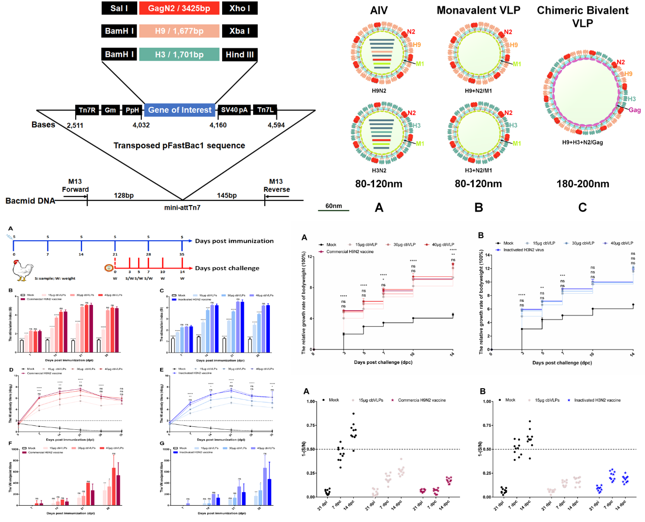 丛彦龙课题组利用病毒样颗粒制备技术,构建了表面展示H9N2和H3N2禽流感病毒抗原的二价嵌合型病毒样颗粒(cbVLPs)。相关研究成果于7月8日在线发表于国际学术期刊《Frontiers in Immunology》《A Single Vaccination of Chimeric Bivalent Virus-like Particle Vaccine Confers Protection against H9N2 and H3N2 avian influenza in Commercial Broilers and Allows a Strategy of Differentiating Infected from Vaccinated Animals》。