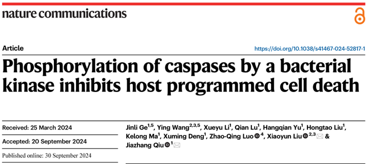 2024年9月30日,意昂体育邱家章教授团队在学术期刊《Nature Communications》上发表,题为“Phosphorylation of caspases by a bacterial kinase inhibits host programmed cell death”的研究论文。
