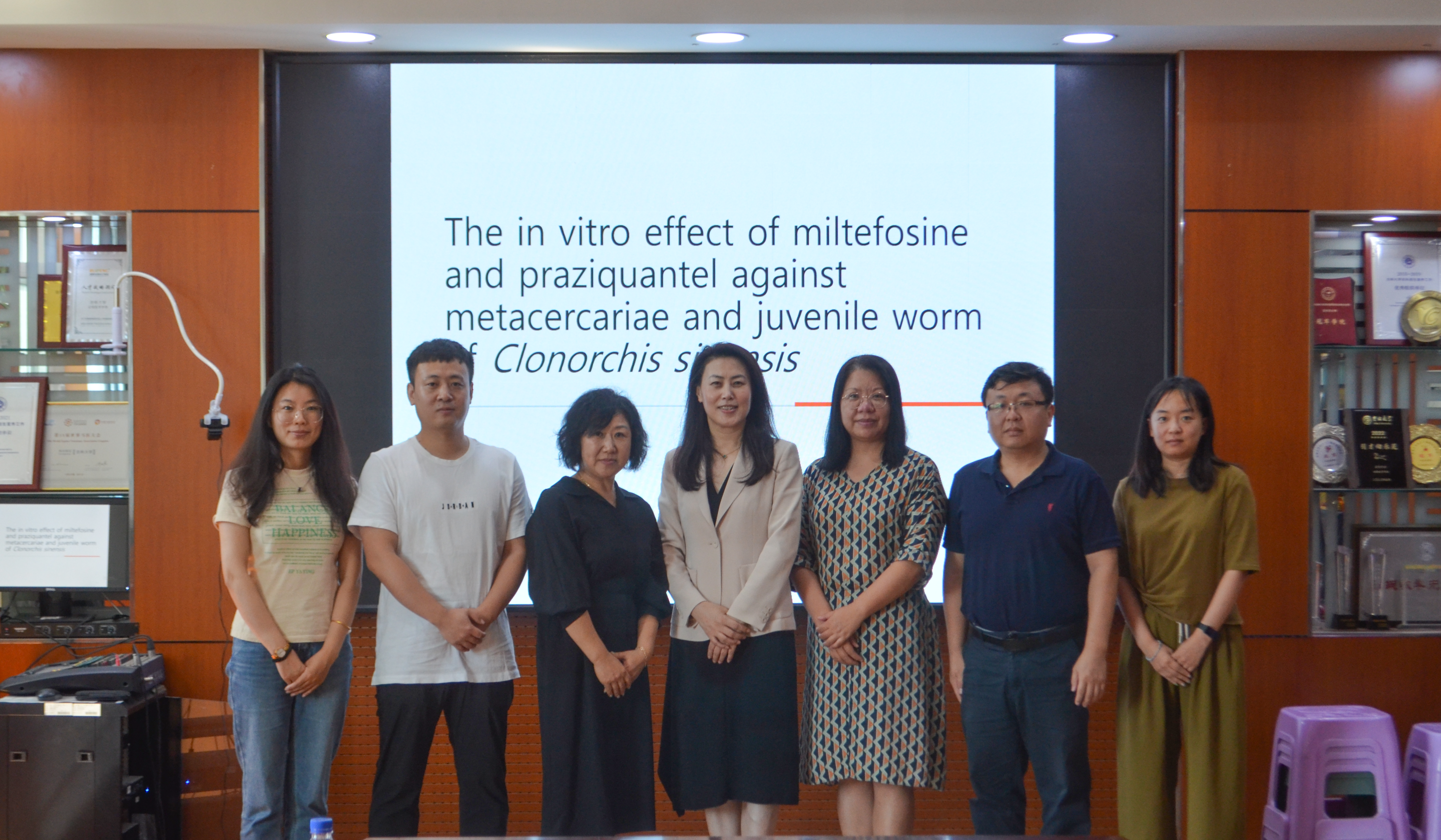 会议伊始,李建华教授对李顺玉教授的到来表示热烈欢迎。随后,李顺玉教授分享了其团队围绕华支睾吸虫病原生物学、诊断程序探索及防控策略开发等方面开展的系列工作,着重介绍了其应用影像筛选技术探索华支睾吸虫活性抑制剂及候选抗虫药物方向的创新性成果,希望今后双方可以进行更深层次的交流。会议现场气氛热烈,李顺玉教授与现场老师和同学就华支睾吸虫药物筛选问题进行充分的探讨。李建华教授表示李顺玉教授的到来加强了两院的合作交流,增进了友谊,并希望以此次交流为契机共同推进科研技术创新发展。会后,李顺玉教授参观了公司动物及人兽共患寄生虫病学实验室,并合影留念。