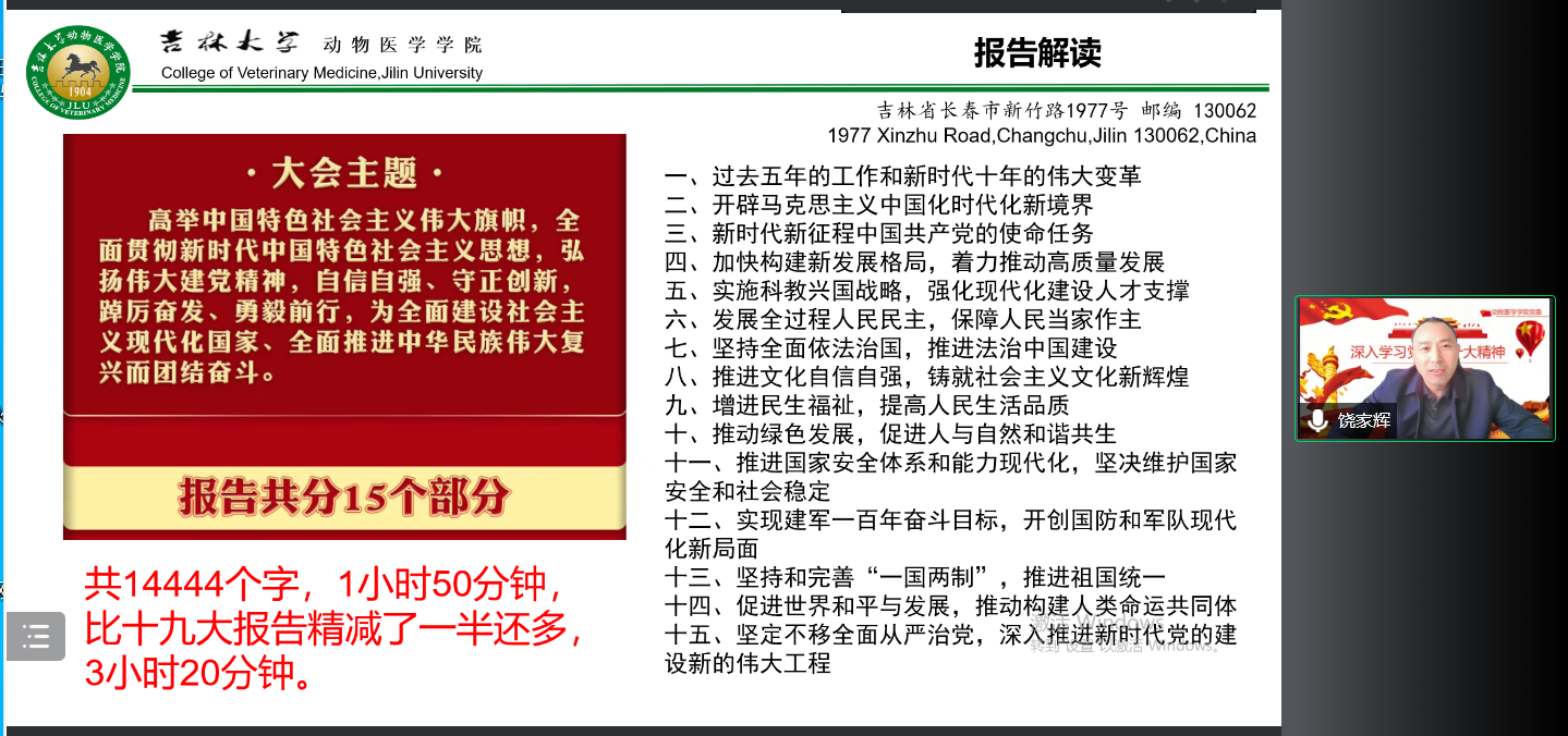 为进一步深入学习和贯彻党的二十大精神,12月8日下午,意昂临床兽医学系教工党支部通过线上形式举行“学习贯彻落实党的二十大精神”专题会议,公司党委书记饶家辉为临床兽医学系全体教工讲专题党课,会议由临床兽医学系主任李心慰主持。