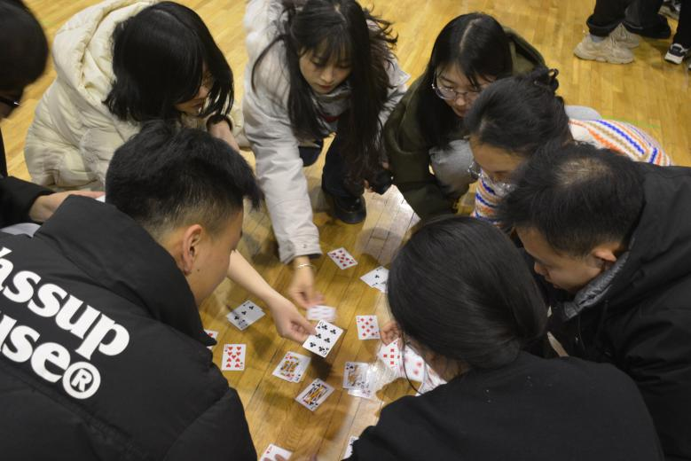 本次素质拓展活动共有六个游戏,第一个游戏是找纸牌。活动前工作人员将五副扑克牌组合在一起打乱,五个小组每组分54张扑克牌,各自商议方案互相之间换牌,先凑出一幅完整扑克牌的部门获胜。这个游戏让每位同学都能充分参与其中,迅速拉近了在场成员之间的距离,活跃了场上气氛。