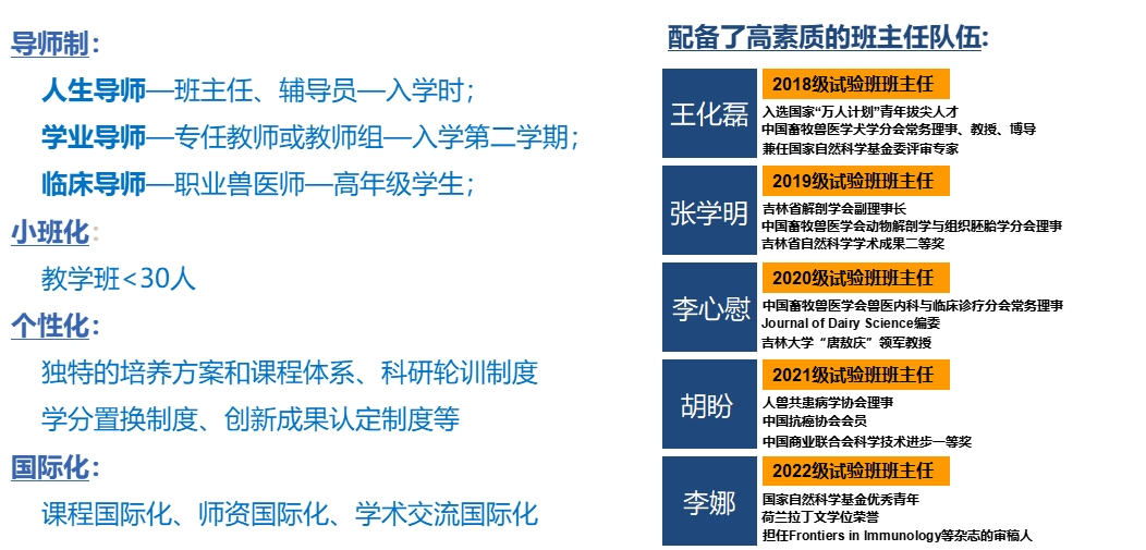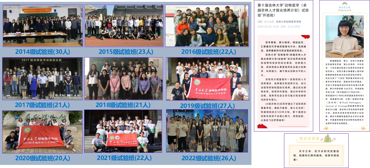 2014年试办卓越人才培养试验班,实行“一制三化”:导师制、小班化、个性化、国际化,现组建10期,累计237名员工,目前读研率为98%,出国交流率41%,科研参与率100%,发表SCI论文影响因子总数154.95,获国家级竞赛奖项59项。以2024届动物医学(卓越农林人才拔尖培养计划)试验班为例,班级27名员工,英语四六级通过率为100%,85%的同学被推免到清华、北大、中科院等双一流A类大学或科研院所,2人入选DVM项目,班级被评为“2023年意昂体育十佳班级”。