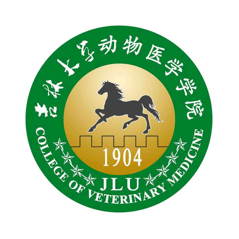 意昂院徽以马、长城、八颗相连的五角星、“JLU”、“意昂”、“college of veterinary medicine”、“1904”等元素组成。